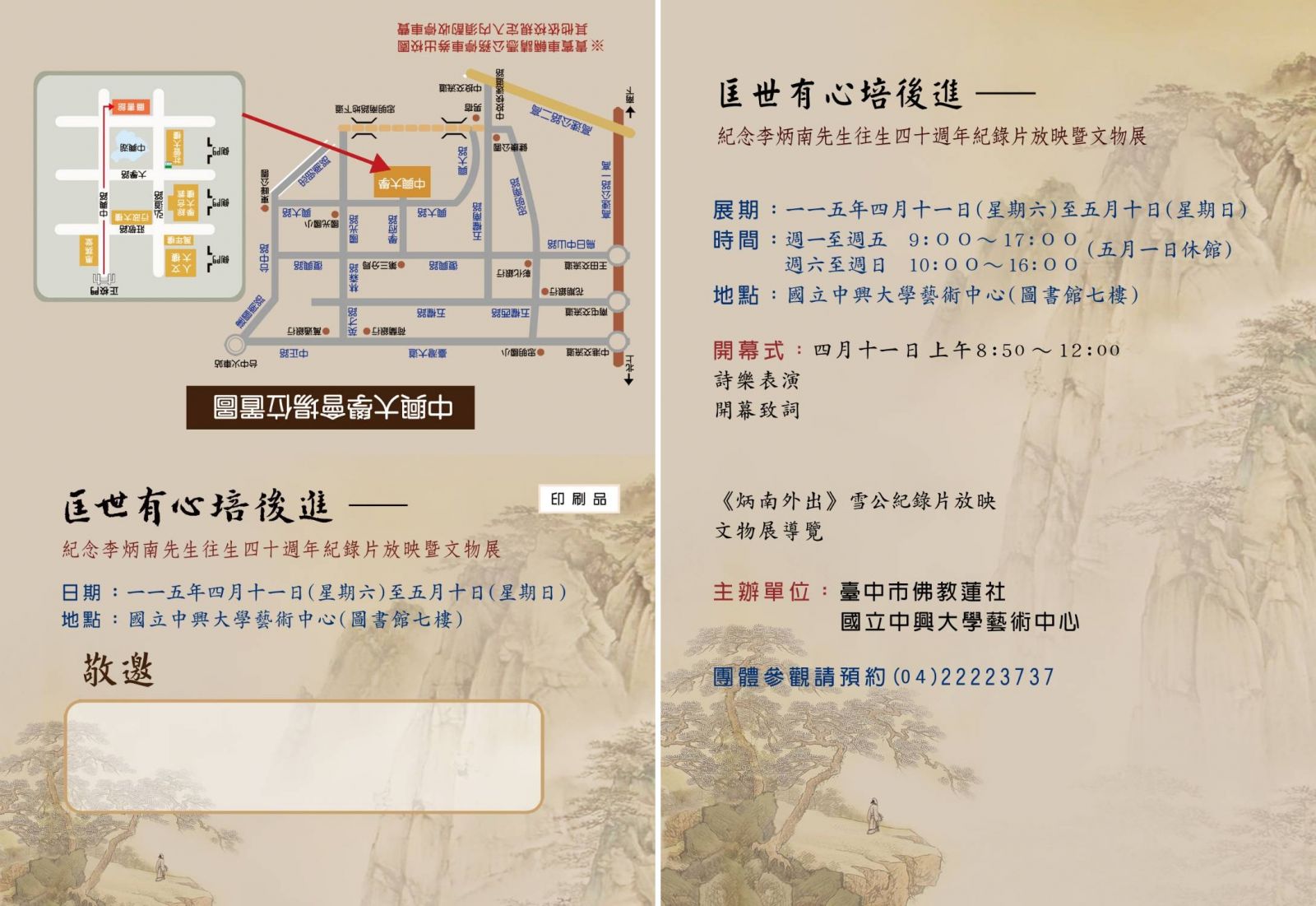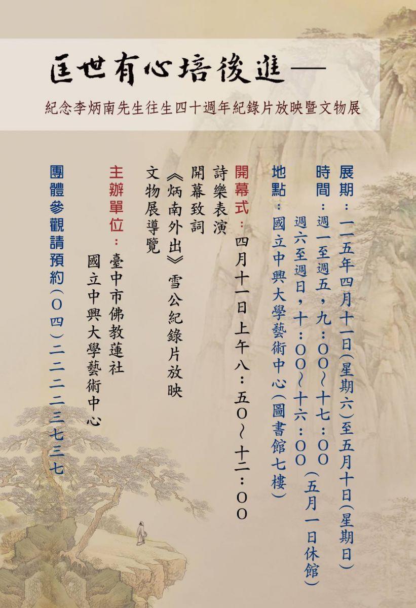 這次臺中蓮社除展覽外,亦與中文系合辦學術研討會,密切銜接的活動,分別以學術觀察、影音紀實、身儀典範,完整勾勒並重現李炳南居士身影與身後影響。展場每日皆安排志工協助導覽,同時為了拉近與觀眾的距離,設計10則「良師的故事」,將艱深的文字轉為淺顯易懂的敘事互動,相信觀者獲益良多,且完成活動將獲得展覽精美紀念品,歡迎大家踴躍蒞臨參觀。