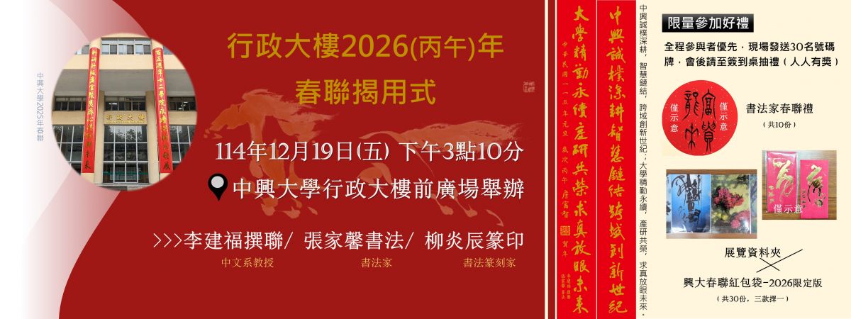 帶著2025(乙巳)辛勤的豐碩成果,喜迎2026(丙午)新春,興大行政大樓春聯也跟著除舊佈新了,訂於12月19日(五)舉辦新春聯揭用式,現場限量好禮發送,歡迎大家共襄盛舉。
